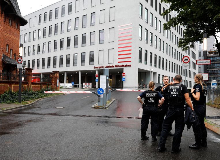 De russische oppositieleider alexei navalny is zaterdag onder politiebegeleiding aangekomen bij een ziekenhuis in berlijn.